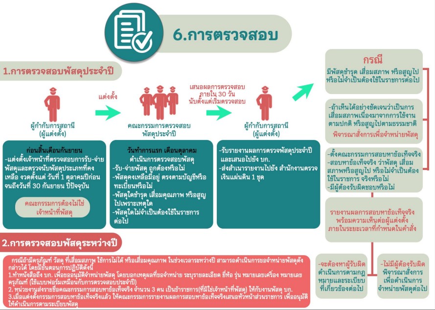 - กำหนดแนวทางควบคุม กำกับดูแลรักษา ตรวจนับ ตรวจสอบสภาพการใช้งานทรัพย์สินของราชการ ของบริจาคโดยเฉพาะทรัพย์ประเภทที่มีความเสี่ยงในการนำไปใช้โดยมิชอบ
