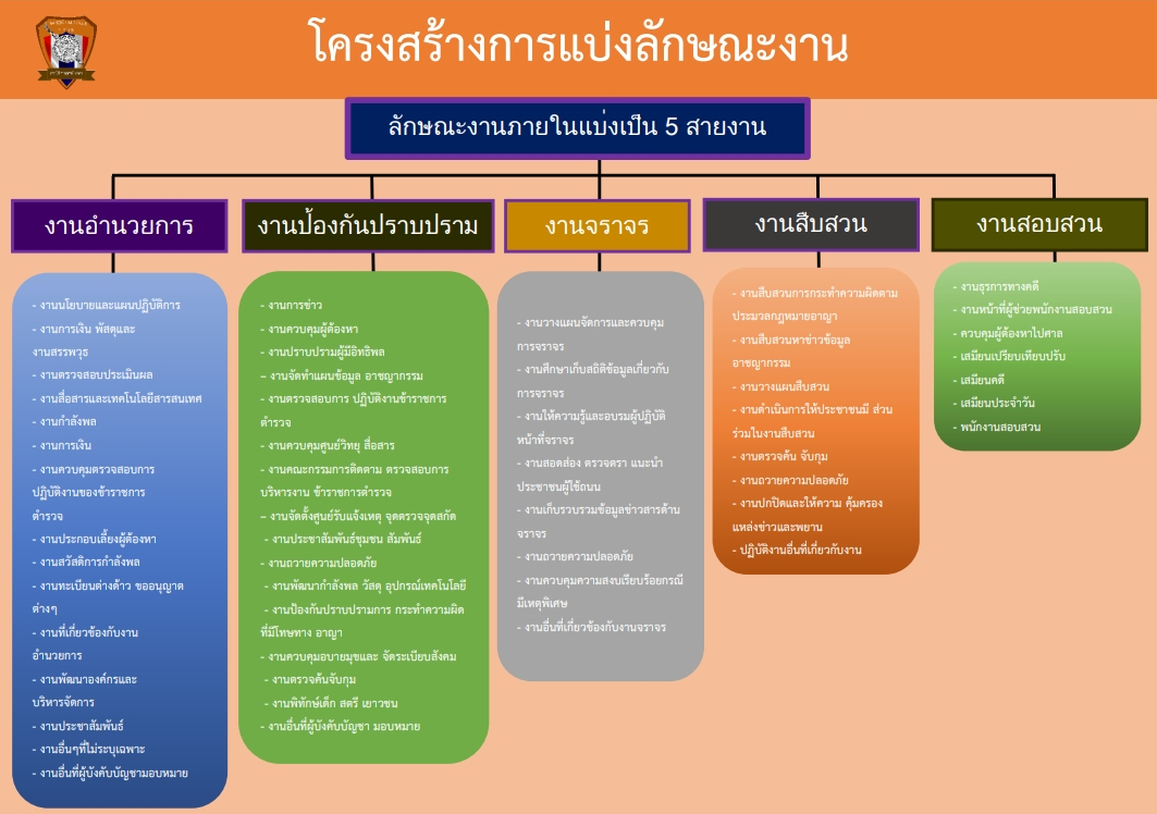 มีหน้าที่เกี่ยวกับการอำนวยการ การวางแผน การตรวจสอบติดตามและประเมินผลงานที่เกี่ยวกับนโยบาย ยุทธศาสตร์ และแผนงานของสถานีตำรวจ งานการบริหารบุคลากร งานจเรตำรวจ งานกิจการพิเศษ งานความมั่นคง การศึกษาการฝึกอบรม งานวิชาการ สวัสดิการ การพัฒนา การบริหารจัดการ งบประมาณ การเงิน การพัสดุ การพลาธิการและ สรรพวุธ การส่งกำลังบำรุง รวมทั้งลักษณะงานอื่นๆ ที่เกี่ยวข้องหรือเป็นส่วนประกอบของงานดังกล่าว เพื่อส่งเสริมหรือสนับสนุนการปฏิบัติงานของสถานีตำรวจ